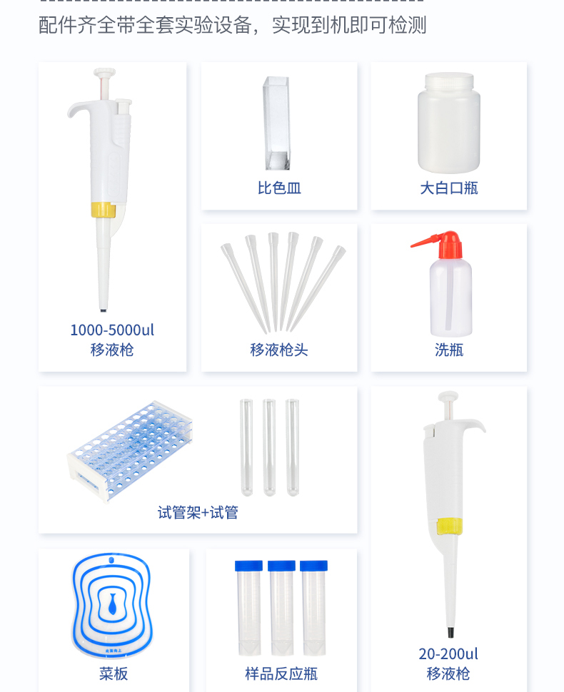 2.仪器构成:由主机、样品前处理器具和试剂包等构成,适于现场及实验室使用