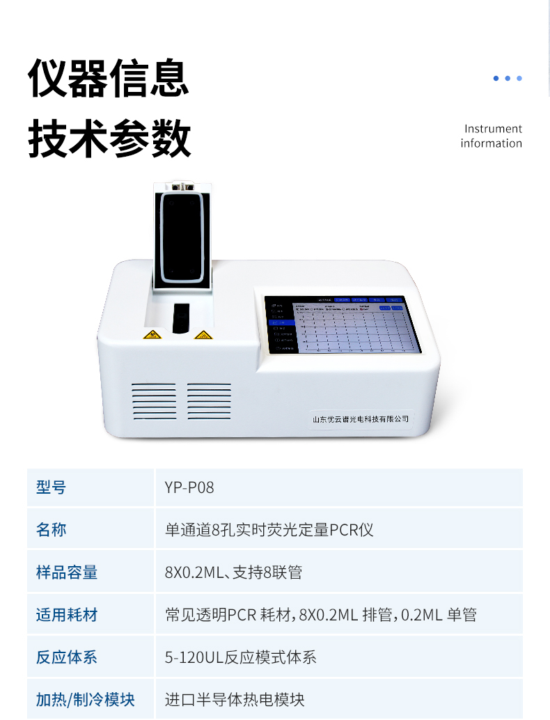 YP-P96型号实时荧光定量PCR系统主要用于运行实时荧光定量PCR实验,通过荧光激发和采集的方式,对实验过程进行实时监控,将实验过程数据绘制成荧光曲线,实时呈现于仪器显示界面,并对实验数据进行拟合和分析,最后可生成PDF格式的实验报告。